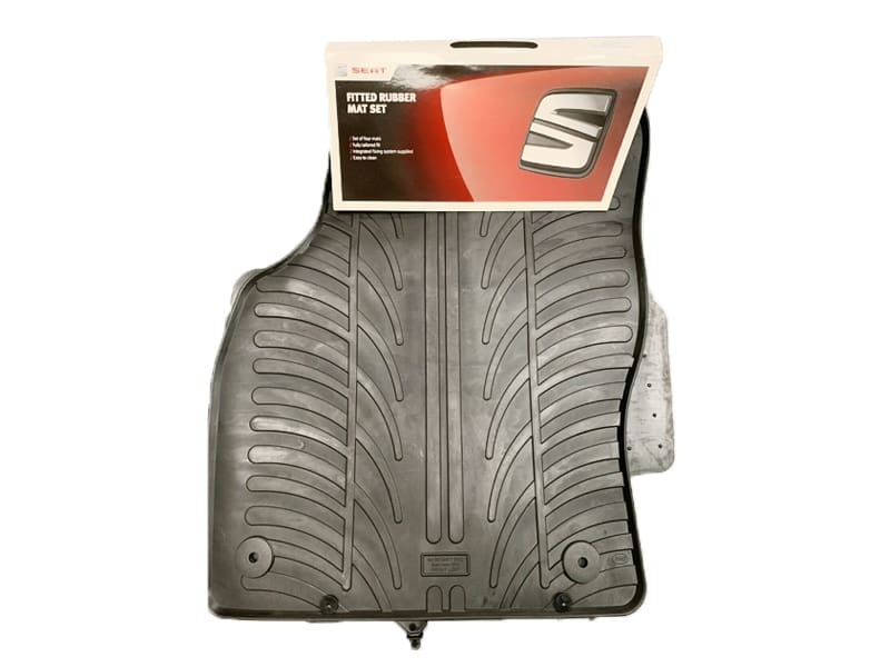 Tailored mat set with fixings to fit vehicle floor types, made from rubber packed in sets of 4 branded SEAT rubber mats.
