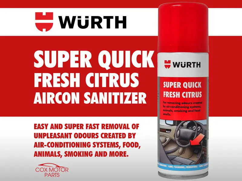 Wurth Super Quick Fresh Citrus Aircon Sanitizer is a long-lasting antimicrobial sanitizer which eliminates harmful bacteria and bad odours from air conditioning systems. It’s simple to use application will clean the entire system in under 20 minutes. Re-treat the vehicle with Wurth Super Quick Fresh Citrus Aircon Sanitizer every 6 months. Motorists can now eliminate harmful bacteria – and the resulting nasty odours – from their car air-conditioning system with Wurth Super Quick Fresh Citrus Aircon Sanitizer. The easy-to-use application treats the entire air-conditioning system in less than 20 minutes and provides durable protection against the return of the unwanted micro-organisms.Â