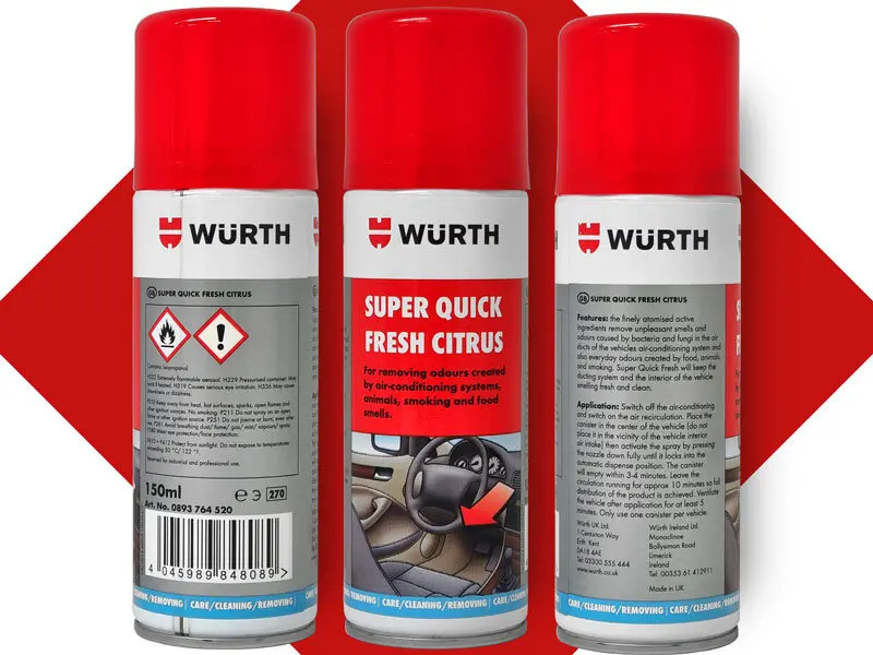 Wurth Super Quick Fresh Citrus Aircon Sanitizer contains active anti-microbial agents which eliminate the bacteria, viruses, moulds and yeasts which not only produce bad odours, but also can cause illnesses. These micro-organisms grow and multiply by the billion within the air-conditioning system when left unused for lengthy periods – such as during the winter months – and, in the worst cases, can cause illnesses such as gastroenteritis and diarrhoea if inhaled.