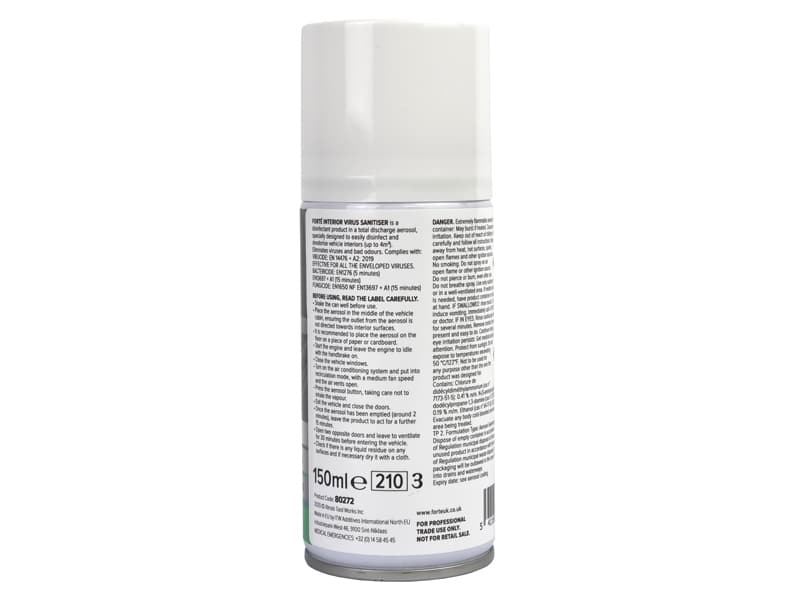 Forté Interior Virus Sanitiser / Aircon Cleaner 150ml is a disinfectant product in a total discharge aerosol, specifically designed to easily disinfect and deodorise vehicle interiors (up to 4m2)