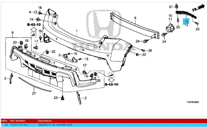 Genuine Honda Civic & FK2 2012-2016 Right Rear Bumper Spacer (71593-TV0-E01)