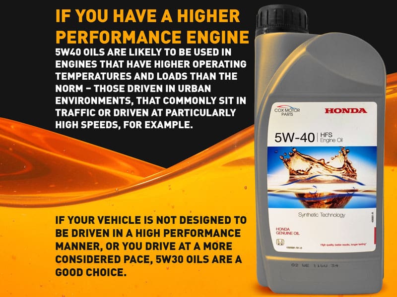 5W-40 oils are likely to be used in engines that have higher operating temperatures and loads than the norm – those driven in urban environments, that commonly sit in traffic or driven at particularly