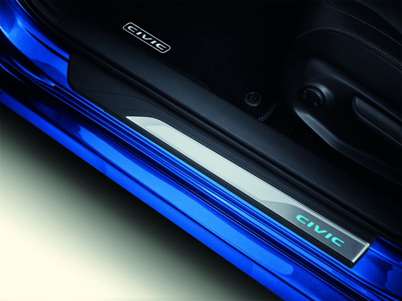 Crafted in brushed stainless steel and blue illuminated “Civic” logo, illuminated door sill trims protect the inner door from marks and scratches. Includes: illuminated front and non-illuminated rear trims. *Not suitable for 1.5 Sport or 1.5 Sport Plus*