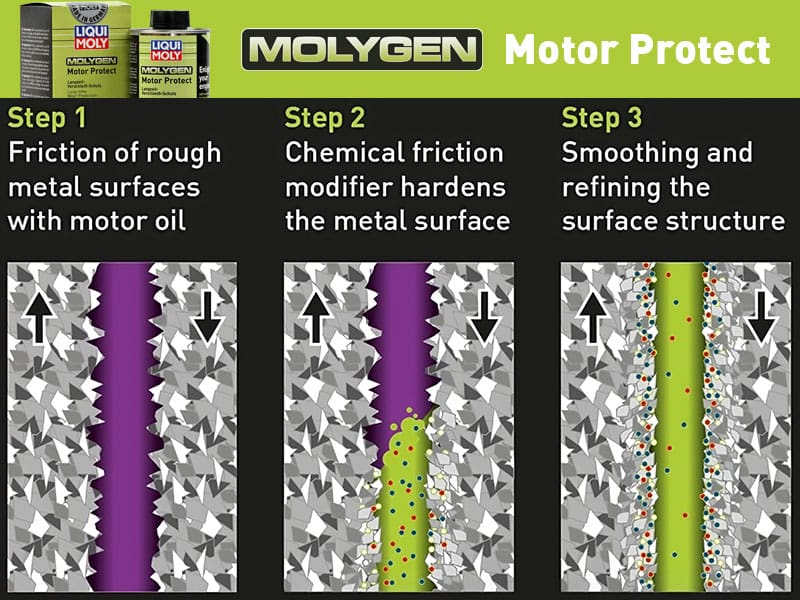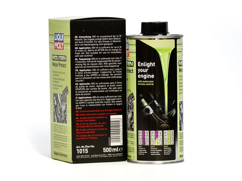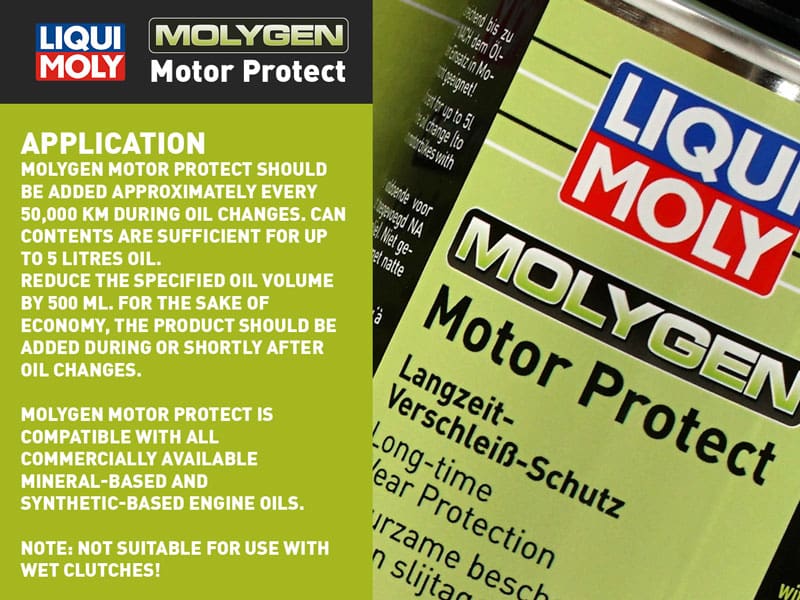 Molygen Motor Protect should be added approximately every 50,000 km during oil changes. Can contents are sufficient for up to 5 litres oil. Reduce the specified oil volume by 500 ml. For the sake of economy, the product should be added during or shortly after oil changes. Molygen Motor Protect is compatible with all commercially available mineral-based and synthetic-based engine oils.