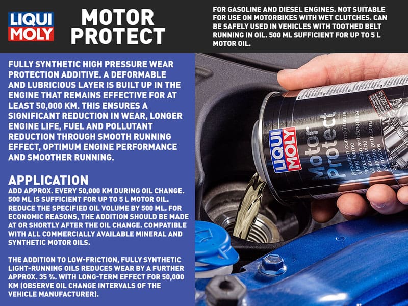 Add approx. every 50,000 km during oil change. 500 ml is sufficient for up to 5 l motor oil. Reduce the specified oil volume by 500 ml. For economic reasons, the addition should be made at or shortly after the oil change. Compatible with all commercially available mineral and synthetic motor oils.