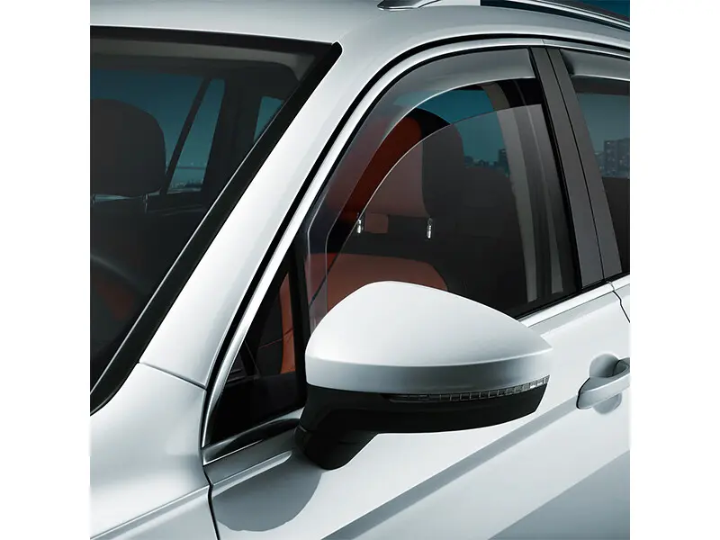 The Volkswagen Genuine rear door wind deflectors for the side vehicle doors enable optimal ventilation of the vehicle interior, thus contributing to your driving comfort. They improve the atmosphere inside the vehicle and enable you to enjoy circulating fresh air even when it is raining or snowing. When the sun is shining, unpleasant heat build-up is prevented in the vehicle interior and annoying wind noise is reduced when the windows are opened to slightly above the lower edge of the wind deflectors. Due to their high quality manufacturing, perfect fit and UV-resistance the moulded acrylic-glass door wind deflectors are easy to clean and car wash proof. The simple plug assembly enables them to be installed and used quickly. The door wind deflectors can be painted in order to customise the vehicle.